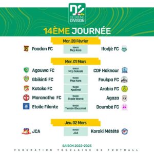 La phase retour du championnat national de football de deuxième division reprend ce mardi 28 Février après une petite pause observée. Les matchs de la 14e journée sont au programme ce mardi, mercredi et jeudi.