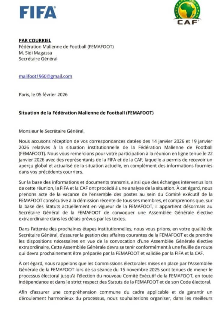La Fédération Malienne de Football (FEMAFOOT) traverse une zone de turbulences institutionnelles sans précédent. Après la démission collective de l’ensemble des membres de son Comité exécutif, la FIFA et la Confédération Africaine de Football (CAF) ont pris les devants pour encadrer la transition et garantir la tenue d’élections conformes aux statuts. Les deux grandes institutions du football ont adressé une correspondance officielle au Secrétaire Général, Sidi Bekaye Magassa, lui confiant la gestion des affaires courantes et la responsabilité de convoquer une Assemblée Générale élective extraordinaire.